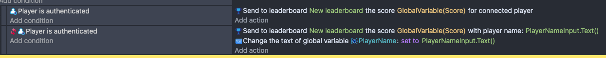 In certain cases, you'll want to know exactly when the user has logged in, so you can greet them with a welcome message, or save their username in the variables. This is particularly useful to implement to handle when a player logs in to a different account, as the condition "Player is authenticated" will always stay true, whereas the condition "Player has logged in" will become true only for a single frame.