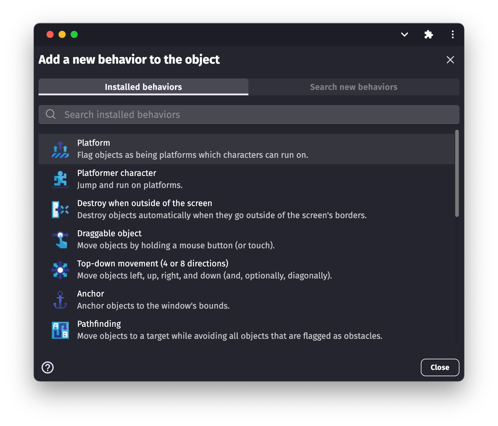 GDevelop comes with two behaviors to build platformer games. This first one, "Platform", allows to mark objects as platforms. The second, "Platformer character", allows the object to run and jump on platforms.
