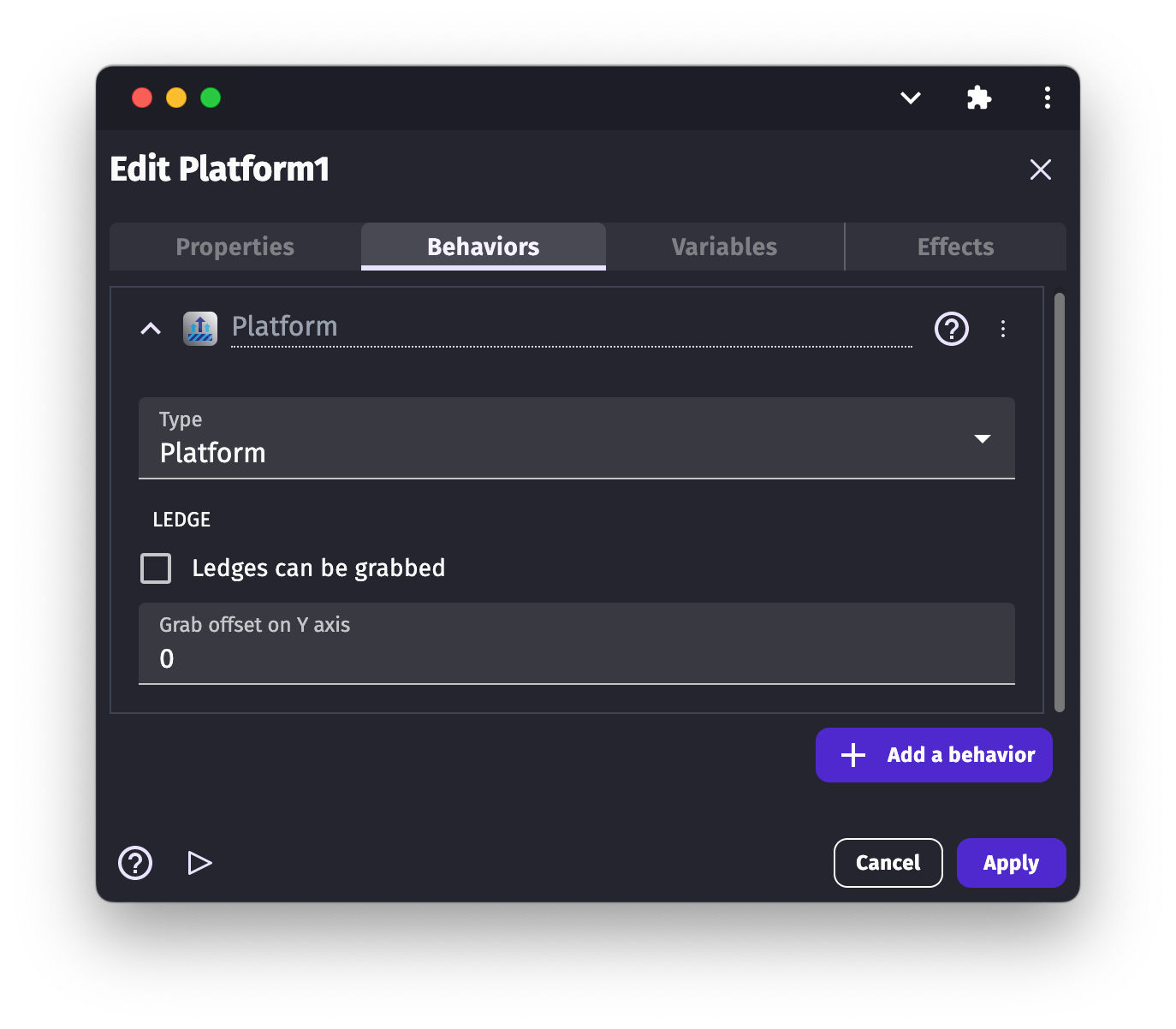 As with the Platform Behavior, we have the "Grab the ledge" option for the "Platformer character". This option allows the character object to grab the ledge of the platforms. The option is disabled by default. To enable it, tick/check the box in the options list.